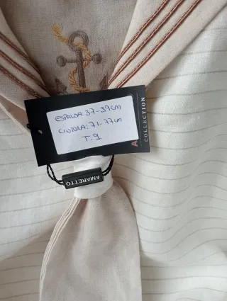 Traje de comunión de la marca Amaretto, talla 9. Un conjunto elegante con un diseño marinero. - Tejido de lino con finas rayas verticales. - Cuello marinero con detalles de pasamanería. - Detalle bordado de ancla en la pechera. - Corbata de lazo integrada en el cuello.