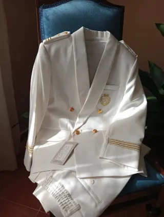 Traje de comunión en color blanco, talla 9. - Chaqueta con doble abotonadura dorada. - Detalles dorados en puños y hombros. - Escudo bordado en el bolsillo. - Pantalón a juego.