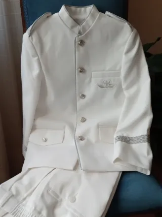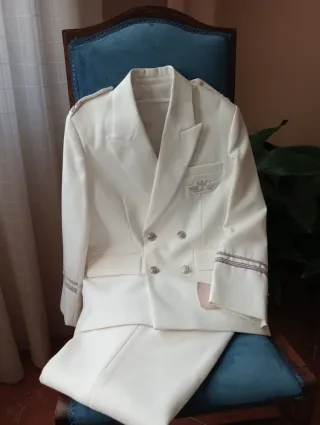 Elegante traje blanco para comunión, talla 6. Perfecto para un día especial. - Chaqueta con detalles plateados en cuello, hombros y puños. - Dos bolsillos frontales en la chaqueta. - Bolsillo superior izquierdo con escudo bordado. - Pantalón a juego.