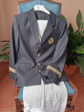 Traje de comunión completo en color azul marino, talla 6. - Chaqueta con detalles en hombros y puños. - Pantalón con cintura elástica. - Insignia bordada en la solapa.