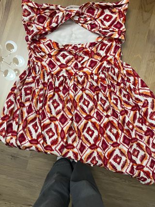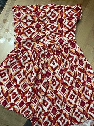 Vestido corto con un estampado vibrante y diseño cruzado en la parte superior. Ideal para un look casual y fresco. - Diseño sin tirantes. - Abertura en la espalda. - Falda con vuelo.