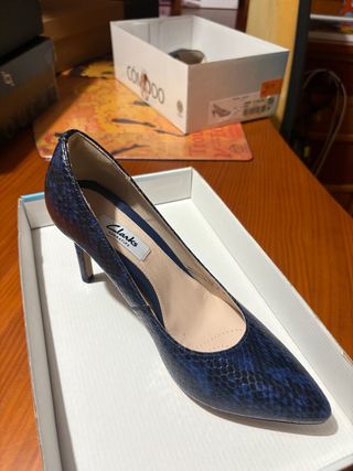 Elegantes zapatos de tacón Clarks con un llamativo estampado de serpiente. - Diseño de punta fina. - Tacón de aguja. - Detalle de logo en la plantilla.