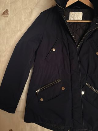 Abrigo elegante de Zara con capucha. - Cierre de cremallera y toggles. - Bolsillos frontales. - Diseño moderno.