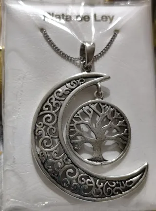 Colgante con diseño de luna y árbol de la vida. - Elaborado en plata. - Detalle de filigranas en la luna. Medida con Arandela incluida 5 cm de arriba abajo.