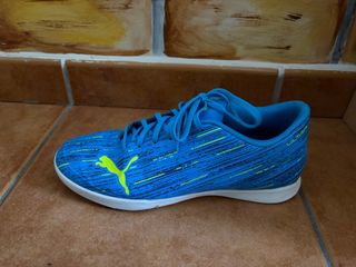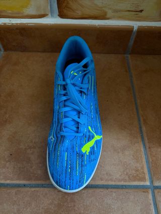 Zapatillas fútbol sala Puma de color azul con detalles en verde. Diseñadas para ofrecer comodidad y estilo. - Diseño moderno con líneas dinámicas. - Logo Puma en contraste.