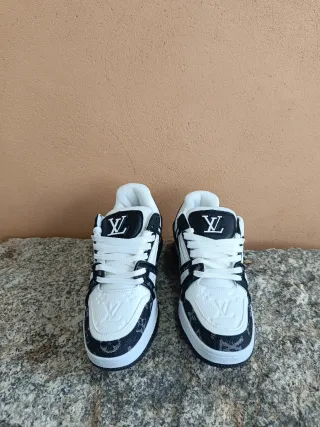 Zapatillas de diseño con el icónico monograma de Louis Vuitton. - Combinación de blanco y negro. - Detalle del logo LV en la lengüeta. - Talla: 42
