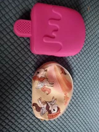 Dos monederos infantiles con diseños alegres. - Un monedero con forma de helado multicolor. - Otro monedero redondo con estampado de unicornio y cerezas.