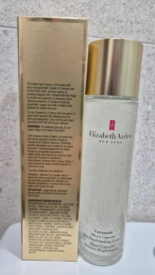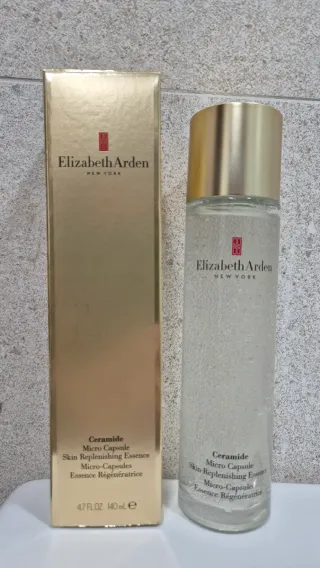 Elizabeth Arden Ceramide Micro Capsule Skin Replenishing Essence. - Contiene 140 ml (4.7 fl oz). - Envase de vidrio con tapa dorada. Nuevo y precintado, mas productos de la marca en mi perfil, por la compra de 2 o mas arreglo precio.