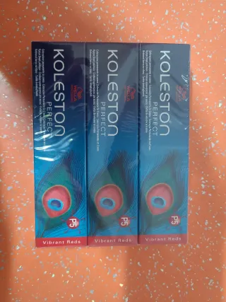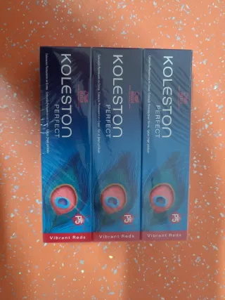 Tres cajas de tinte para el cabello Koleston Perfect en el tono P5, un vibrante rojo. - Tono: P5 Vibrant Reds - Marca: Wella - Tipo: Coloración permanente en crema