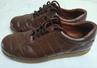 Zapatillas de piel en color marrón. Puntera redonda. En buen estado, con algún ligero desgaste en la parte del talón, la suela y el logotipo.