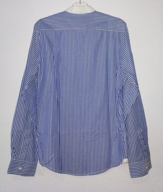 Camisa de manga larga con un diseño de rayas verticales azules y blancas. Presenta un cuello mao y un canesú en contraste. - Cuello mao. - Diseño de rayas. - Canesú.