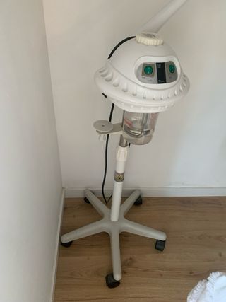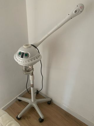 Vaporizador facial para tratamientos de belleza. Cuenta con un diseño moderno y funcional. - Brazo ajustable para dirigir el vapor. - Base estable con ruedas para fácil movilidad. - Depósito de agua visible.