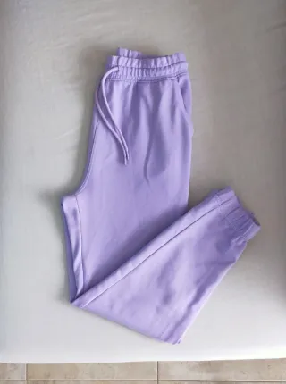 Pantalón tipo jogger de Decathlon en color lila. Cómodo y versátil. - Cintura elástica con cordón. - Puños ajustados en los tobillos. - Bolsillos laterales.