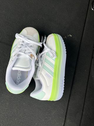 Zapatillas deportivas Adidas con un diseño moderno y llamativo. - Combinación de colores blanco y verde lima. - Detalles de las tres rayas. - Plataforma gruesa.