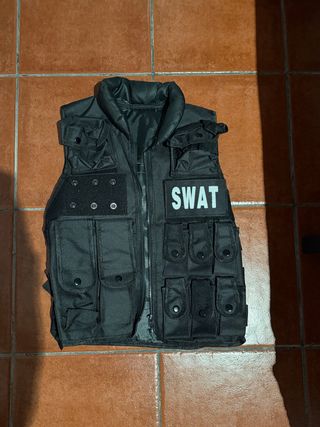 Chaleco táctico estilo SWAT, ideal para actividades al aire libre o disfraces. Se uso una vez - Diseño con múltiples bolsillos frontales. - Cierre de cremallera. - Parche frontal con el logo SWAT.