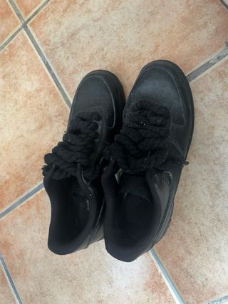 Zapatillas Nike Air Force 1 en color negro con un diseño único. - Cordones personalizados de cuerda gruesa. - Diseño monocromático.