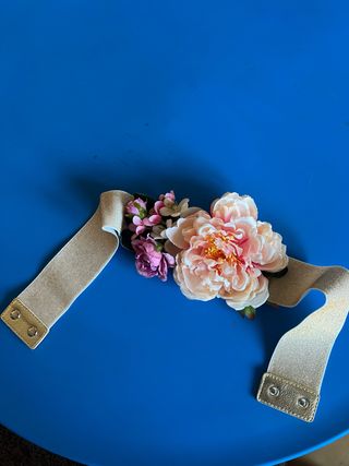 Cinturón artesanal con un diseño floral delicado y un acabado brillante. - Base elástica dorada. - Adornado con flores en tonos rosa y melocotón. - Cierre con broches metálicos.