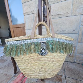 Capazo de fibras naturales de la firma Simó Sastre - Material de palma. - Adorno de pedrería y flecos en la parte superior. - Cierre con cremalleta - Asas largas de cuero y cortas