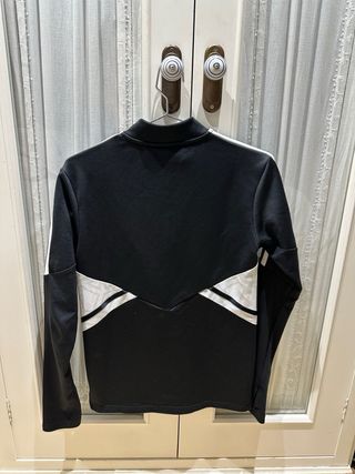 Camiseta técnica Adidas de manga larga en color negro. Presenta el logo de la marca en blanco en el pecho y las tres icónicas franjas blancas en los hombros y mangas. Talla XS sin estrenar de hombre - Diseño con media cremallera. - Paneles laterales en blanco. - Tejido transpirable Aeroready.