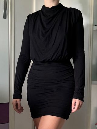 Vestido negro de manga larga con un diseño drapeado. El tejido es elástico y fruncido en la falda. Tiene una bonita espalda abierta. No dude en contactar si tiene alguna duda. Envíos y entregas en Laredo.