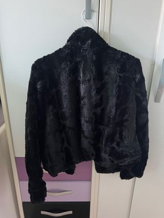 Chaqueta corta de pelo sintético. Es corta con cuello y cierre de cremallera frontal. No dude en contactar si tiene alguna duda. Envíos y entregas en Laredo.