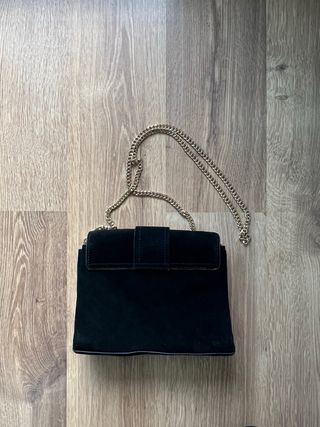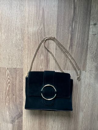 Elegante bolso negro con detalles dorados y cadena. Material exterior de ante y cierre con solapa. Adorno frontal de anilla dorada y cadena metálica dorada para llevar al hombro o cruzado. No dude en contactar si tiene alguna duda. Envíos y entregas en Laredo.