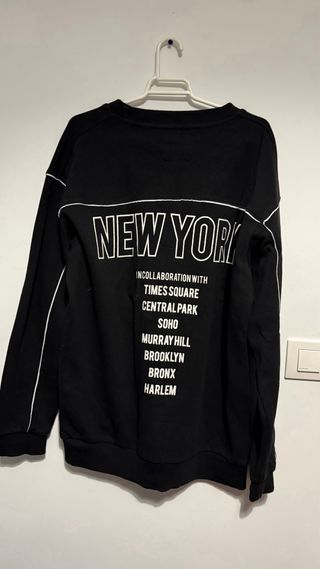 Sudadera negra con detalle NY en el pecho y ribetes blancos. - Diseño moderno. - Cuello redondo. - Manga larga. - Unisex.