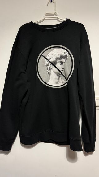 Sudadera negra con un diseño gráfico en el pecho. - Diseño de busto clásico dentro de un círculo con línea. - Manga larga. - Cuello redondo.