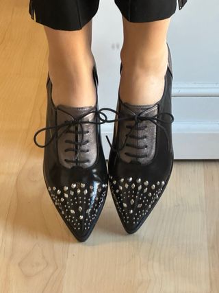 Elegantes zapatos de piel de la marca LODI. Magníficos blucher bicolor, negro y plata vieja con tachuelas. Todo piel por fuera y por dentro. Con cordones para mejor sujeción. Nunca puestos, a estrenar con su caja. - Diseño con tachuelas plateadas. - Combinación de piel negra y detalles plateados.