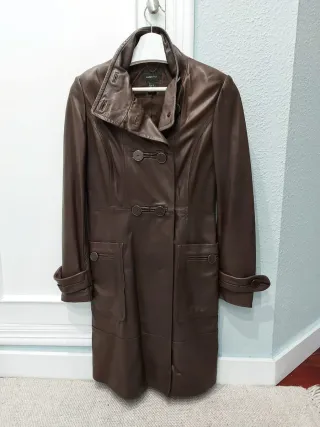 Elegante abrigo de cuero vacuno, perfecto para añadir un toque sofisticado a tu armario. Preciosa en talla L pero talla como una M. Ver medidas abajo. Botones ocultos, bolsillos y cinturón. Cuero auténtico de muy buena calidad. La gabardina tiene cuerpo, es una piel fuerte que abriga. Muy femenina y estilosa. Impecable, no tiene ninguna falta porque no ha tenido uso. Color negro y forrada entera con dos bolsillos. Dimensiones; De axila a axila 48 cm De cintura 43 cm De hombros 43 cm De manga 62 cm De largo 100 cm