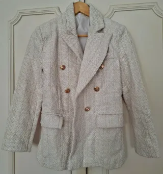 Elegante traje de tres piezas en color beige. Incluye chaqueta, chaleco y pantalón. Perfecto para bodas, celebraciones y ocasiones formales. El pantalón es flexible y se adapta a la cintura, con banda elástica para mayor comodidad. Lo vendo porque me queda grande. Fue comprado por encargo y está sin estrenar. No se vende por separado. Talla EU 56 XXL Medidas: - Hombro: 54.2 cm - Pecho: 128 cm - Largo: 76 cm - Largo de la manga: 66.4 cm