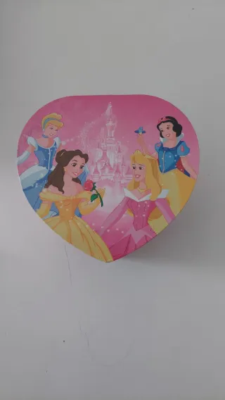 Caja con forma de corazón decorada con princesas de Disney y un castillo. - Diseño de princesas Disney. - Forma de corazón. - tiene musica. Comprado en euro Disney