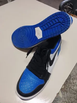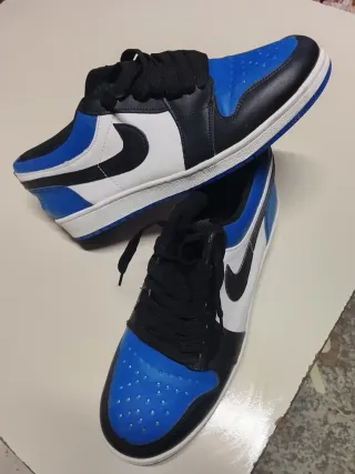 Zapatillas bajas de la marca Nike con un diseño moderno y llamativo. - Combinación de colores azul, blanco y negro. - Estilo deportivo y casual.