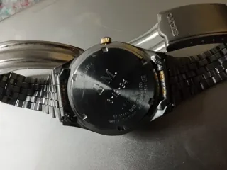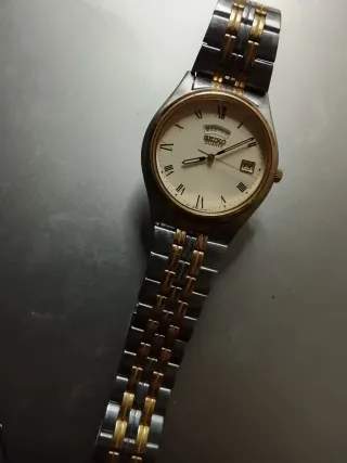 Reloj de pulsera Seiko con un diseño clásico y elegante. - Caja y brazalete de acero inoxidable. - Bisel con detalles dorados. - Resistente al agua.