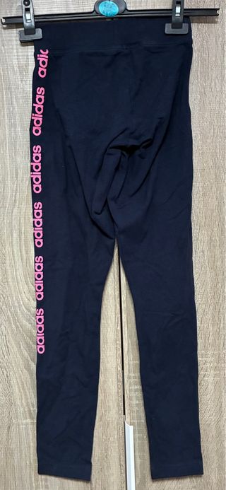 Leggings deportivos de Adidas con el diseño clásico de tres rayas a los lados. - Diseño de tres rayas blancas a los lados. - Logo de Adidas en la parte superior. -La talla también podría valer para una s