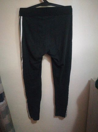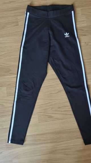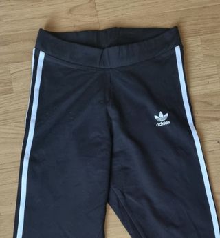 Leggings deportivos Adidas en color negro, talla XS (equivalente a 34 o 6). Están en buen estado y son ideales para hacer ejercicio. - Diseño clásico con tres bandas laterales. - Tejido suave y cómodo.