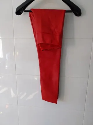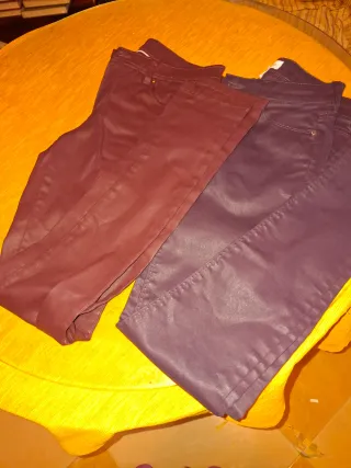 Pantalones de cuero de la marca Mango en talla 32. Poco uso. - Color rojo y morado. - Material: cuero elastico