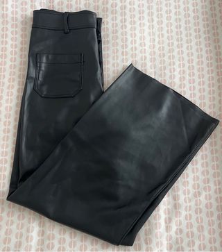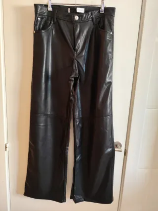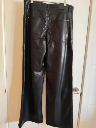 Pantalón de estilo ancho, confeccionado en material que imita el cuero. - Diseño de pierna ancha. - Cierre de cremallera y botón. - Bolsillos delanteros y traseros. -Nuevo sin etiqueta. - Queda muy bien, tengo camisa/cazadora a juego en mi perfil.