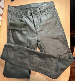 Pantalón de efecto cuero con un acabado brillante. - Color verde con reflejos plateados. - Diseño con bolsillos. - Cierre de botón y cremallera.