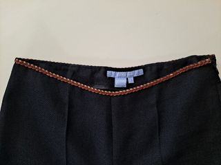 Pantalón negro de vestir de Zara. Tiene un detalle de cinturilla trenzada de cuero. Con cremallera en un costado. La parte de arriba se ajusta a la talla y la pata es amplia con muy buena caída. Talla:36