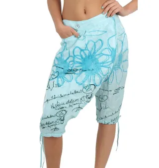 Pantalones capri de la marca Desigual con un diseño vibrante y original. - Estampado floral y de texto en tonos azules. - Tejido ligero y cómodo. - Detalle de cordones en los bajos.