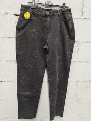 Pantalón vaquero con estampado de caritas sonrientes. - Diseño divertido y original. - Parche de smiley en el bolsillo. - Corte moderno.