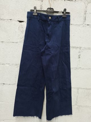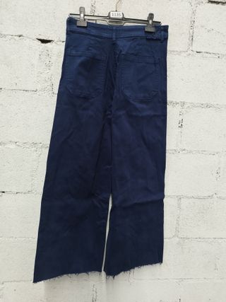 Pantalón de corte ancho con un diseño desigual en el bajo. - Color azul marino. - Bajo deshilachado. - Dos bolsillos traseros.