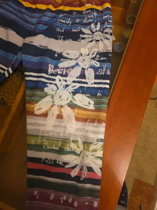 Pantalones cagaos de la marca Desigual con un diseño único y llamativo. - Estampado floral en tonos azules y turquesa. - Detalle de escritura y motivos gráficos. - Bajo con cordones ajustables.