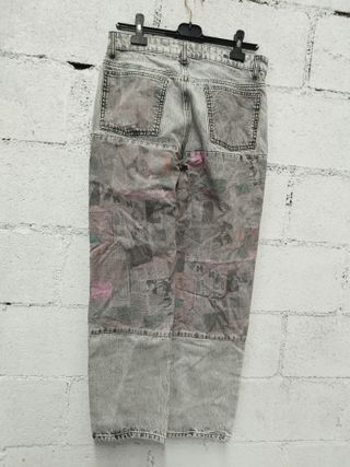 Pantalón vaquero con un diseño único y llamativo. - Parches de Mickey Mouse y estilo patchwork. - Efecto desgastado y rotos. - Lavado ácido característico.