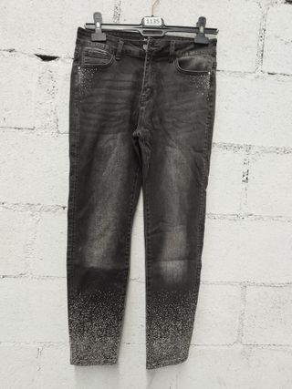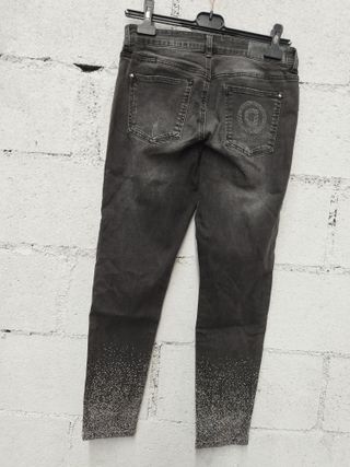 Pantalón vaquero de la marca Desigual en tono gris. Presenta un diseño moderno con detalles brillantes. - Decoración de pedrería en los bolsillos delanteros. - Adorno de pedrería en los bajos de las perneras.