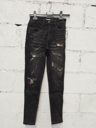 Pantalón vaquero de la marca Desigual en color negro. Presenta un diseño desgastado y roto con detalles de parches y costuras. - Diseño moderno y atrevido. - Corte ajustado. - Detalles de rotos y parches decorativos.