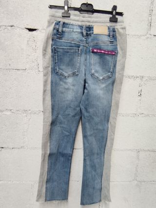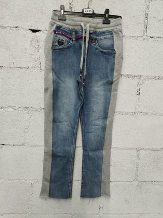 Pantalón de la marca Desigual con un diseño original que combina denim y tejido de chándal. - Parte delantera de estilo vaquero. - Laterales y parte trasera de tejido de chándal gris. - Cintura con cordón ajustable. - Bajo deshilachado.