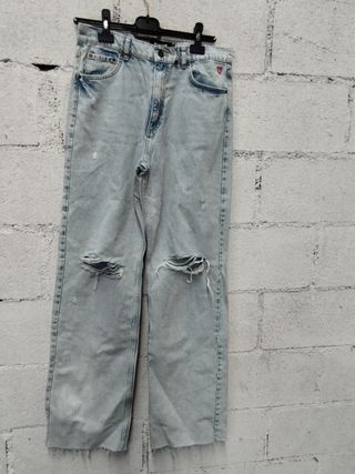Pantalón vaquero de la marca Desigual con un estilo desgastado y moderno. - Diseño con rotos en las rodillas. - Estilo de pierna ancha. - Acabado deshilachado en el bajo.