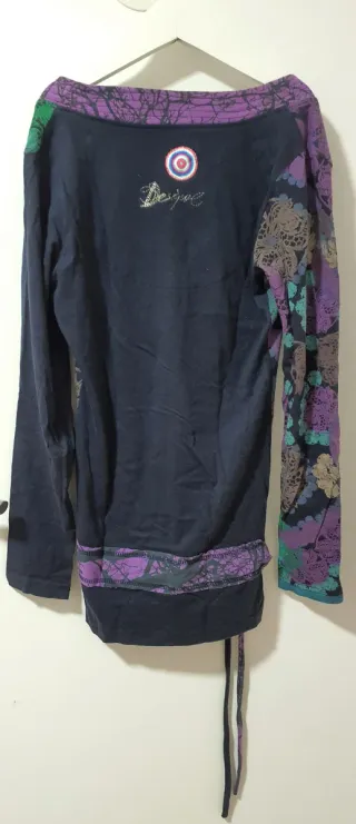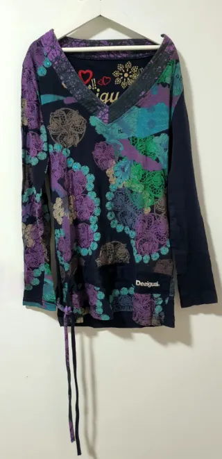 Camiseta Desigual original, manga larga, talla XS. Diseño muy característico de la marca, con estampado boho multicolor en tonos morados, verdes y turquesas. Cuello en pico, detalles bordados y cordón ajustable lateral que estiliza mucho la silueta. Manga larga Tejido suave y cómodo Logo Desigual bordado y detalles gráficos originales Corte favorecedor con ajuste lateral Estilo boho / casual Talla: XS buen estado general Ideal para looks casuales con vaqueros o leggings.